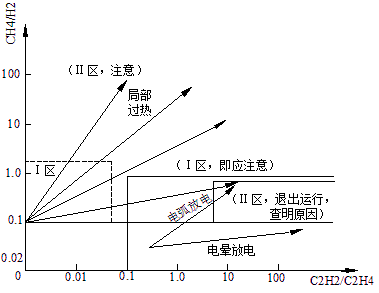 用TD圖法(見圖1-1)可以區分變壓器是過熱故障還是放電故障,按其比值劃分局部過熱、電暈放電和電弧放電區域。用這個方法能迅速、正確地判斷故障性質,起監控作用。通常變壓器的內部故障,除懸浮電位的放電性故障外,大多以過熱狀態開始,向過熱Ⅱ區或放電Ⅱ區發展。而以產生過熱故障或放電故障引起直接損壞而告終。放電Ⅱ區屬于要嚴格監控并及早處理的重大隱患。當然,這并不是說在過熱Ⅱ區運行就無問題,例如當CH4/H2比值趨近于3時,就可能出現變壓器輕瓦斯動作,發出信號。